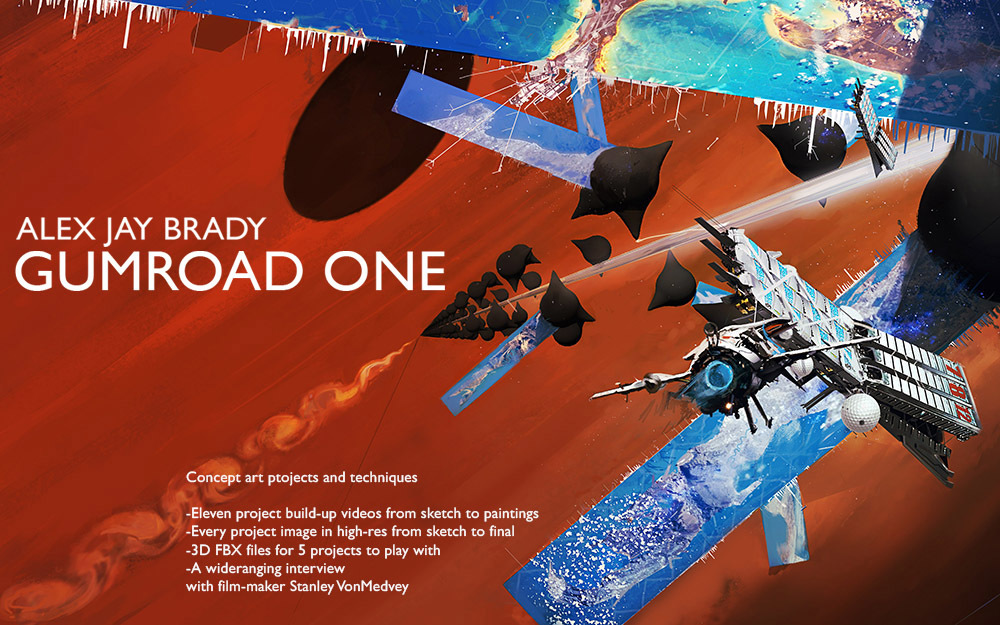 -Walkthroughs for 11 of my projects, ranging from 2 minutes to over 20 minutes, showing the project progress from earliest sketches to finished paintings. Every image and chronological build-ups of the final images. -All the associated sketches and renders shown in these videos -A wide-ranging1 hour conversation with film-maker and artist Stanley VonMedvey. -3D files for 'Space Vegas' 'Batmobile' 'I Drink Your Milkshake' 'Journey to the Geometry Stack' 'Gosper Glider' for you to play with.